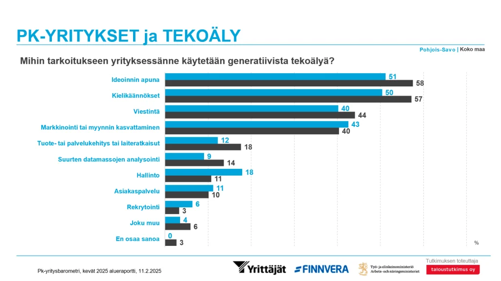 Tekoäly on yksi suurimmista teknologisista murroksista sitten internetin yleistymisen. Sen potentiaali liiketoiminnan tehostamisessa ja kilpailukyvyn parantamisessa on valtava, mutta Pk-yritysbarometri 2025 osoittaa, että pk-yritykset eivät ole vielä ottaneet teknologiaa laajasti käyttöön. Suurin este on tiedon ja osaamisen puute, joka korostuu erityisesti Pohjois-Savossa.