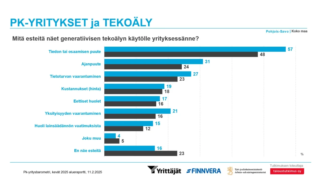 Pohjois-Savon yrityksillä on lisäksi enemmän haasteita tekoälyn käyttöönotossa kuin muualla Suomessa. 57 % alueen yrityksistä mainitsee tiedon tai osaamisen puutteen merkittävimpänä esteenä, kun koko maan keskiarvo on 48 %. Samalla vain 16 % kokee, ettei tekoälyn hyödyntämiselle ole esteitä – koko maan vastaava luku on 23 %. Tämä viittaa siihen, että kiinnostuksen lisääntyminen ei yksin riitä, jos yrityksiltä puuttuu konkreettisia keinoja tekoälyn hyödyntämiseen.