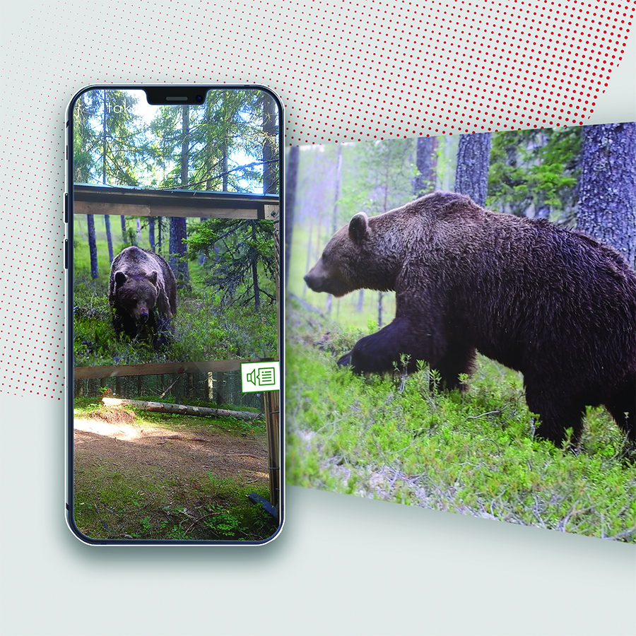 Salmi AR lisätyn todellisuuden sovelluksessa sisällöksi viedyt Suomen luonnon eläimet hämmästyttävät ja ihastuttavat Puijo Peakin luontopolkujen varrella.